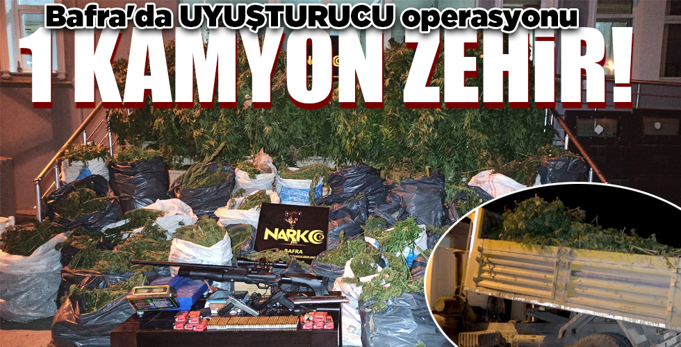 Bafra Cumhuriyet Başsavcılığı koordinesinde 05.10.2022 tarihinde Bafra İlçe Emniyet Müdürlüğü Narkotik Suçlarla Mücadele Grup Amirliği ekiplerince yapılan istihbari çalışmalar sonucunda Doğanca Mahallesi’nde Suat K.’ya (33) ait araziye Asayiş Büro Amirliği ekipleriyle birlikte düzenlenen operasyonda arazide ekili yaklaşık 1 ton 200 kilo dişi Hint keneviri, Suat K’ya ait evde yapılan aramada da yaklaşık 300 kilo kubar esrar maddesi ile 1 adet havalı tüfek, 1 adet kuru sıkı tabanca, 2 adet havalı tabanca, 1 adet pompalı av tüfeği, 450 adet tabanca fişeği, 2 adet hassas terazi ele geçirildi.