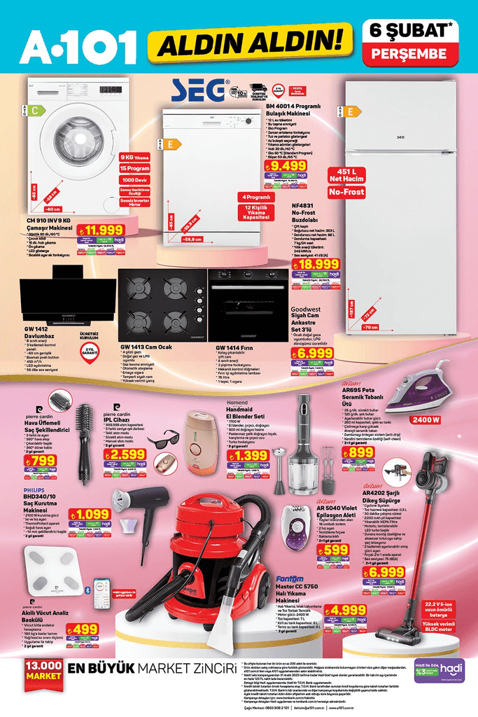A101, yeni aktüel kataloğundaki indirimlerin 6-13 Şubat tarihleri arasında geçerli olacağını paylaşırken, bu tarihlerde seramik tabanlı ütüden sucuğa, kesme tahtasından buzdolabına kadar hemen her kategorideki ürünlerin A101 Market’lerde satışa sunulacağını duyurdu.