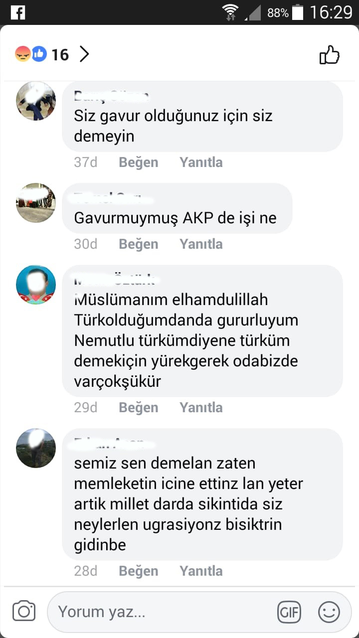 İbrahim Semiz’i, “Ülkesini, milletini sevmemekle” suçlayan Bafralılar ayrıca, “Müslümanız elhamdülillah. Türk olduğumuz için de gururluyuz. Ne mutlu Türküm diyene demek için yürek gerek. O da bizde var. Millet sıkıntı içerisinde siz nelerle uğraşıyorsunuz. Irkını inkâr edene kâfir derler. Sözlerine dikkat et. Bafra’mızdan böyle bir zihniyet çıkmaz” yorumlarında bulundu.