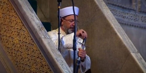 Ayasofya’da 86 yıl sonra ilk cuma namazı kılındı… Ayasofya Camii’nde 4 minareden 4 müezzin önce sela, ardından ezan okudu. Sünnet namazı sonrası kılıç geleneğiyle hutbe okuyan Diyanet İşleri Başkanı, farz namazını kıldırdı. Cuma namazında Cumhurbaşkanı Erdoğan’ın yanı sıra birçok siyasetçi ve çok sayıda davetli saf tuttu. Erdoğan, namaza 350 bin kişinin katıldığını açıkladı.