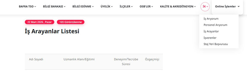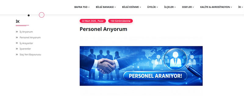 Bafra Ticaret ve Sanayi Odası, güncellenen internet sitesi kapsamında işverenlere yönelik önemli bir yeniliği hayata geçirdi. Hizmete sunulan İnsan Kaynakları modülü sayesinde Oda üyeleri, personel arama ve başvuru süreçlerini artık tek platform üzerinden kolaylıkla yönetebilecek.