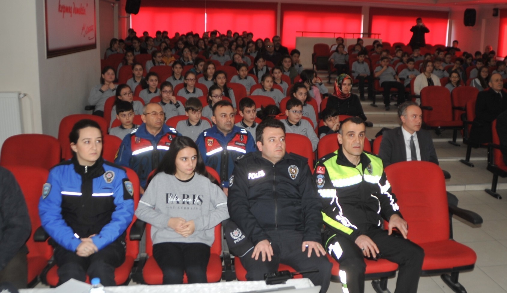 Kaymakam Adanur’un konuşmasının ardından İlçe Emniyet Müdürlüğü ekiplerince gerçek mekanlarda çekilen yaya geçitleri ve kaldırımda yayaların davranması gereken kuralları içeren ilk spot film “Yaya Güvenliği” eş zamanlı olarak ilk ve orta okullarda aynı anda internet aracılığıyla canlı olarak 6 bin öğrenciye gösterimi yapıldı.