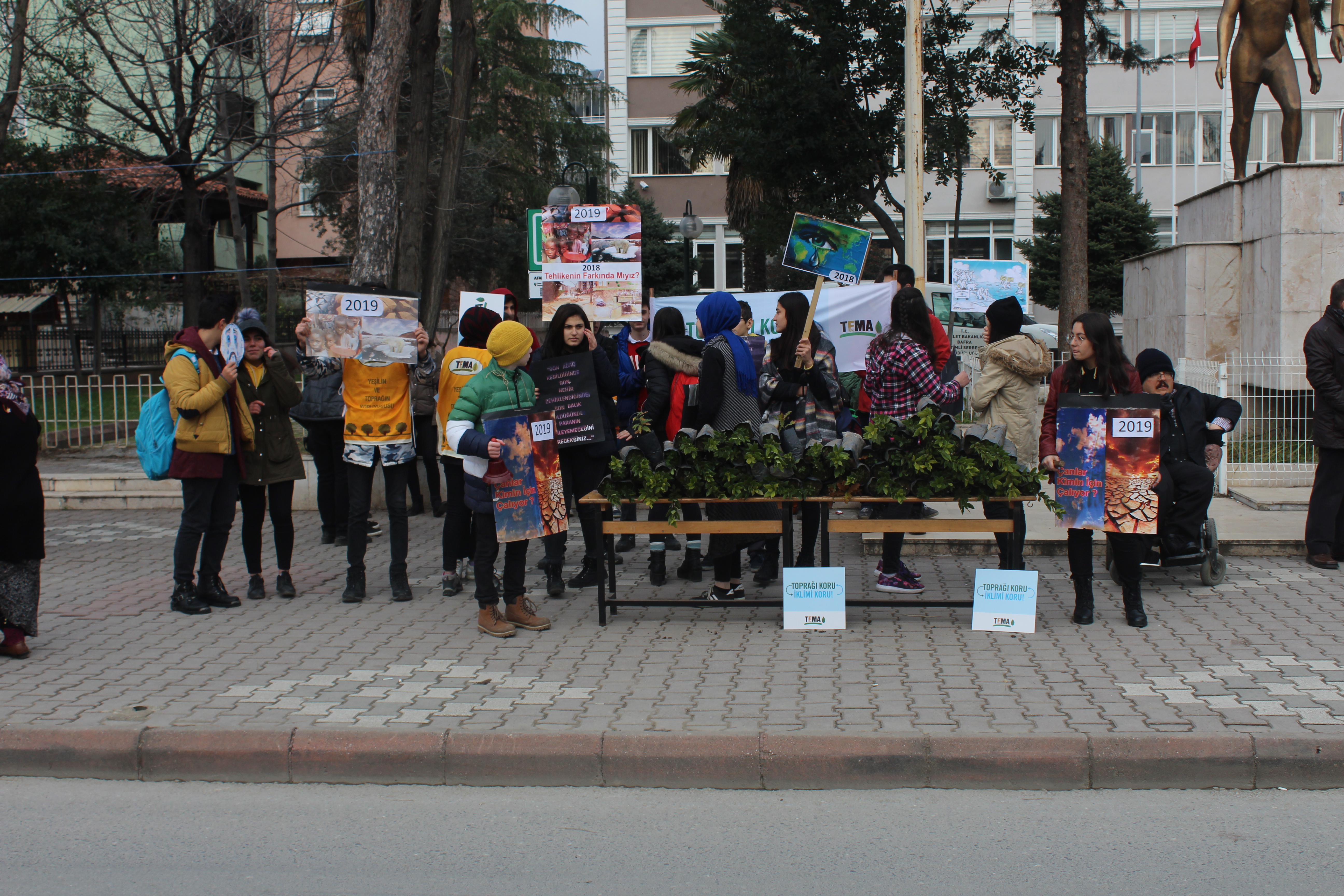 Ecek Acaklı adlı öğrencinin hazırlamış olduğu ellerinde Türkçe ve İngilizce pankartlar taşıyan öğrenciler, çan çalarak, kuraklık ve sel faaliyetlerine dikkat çekti.