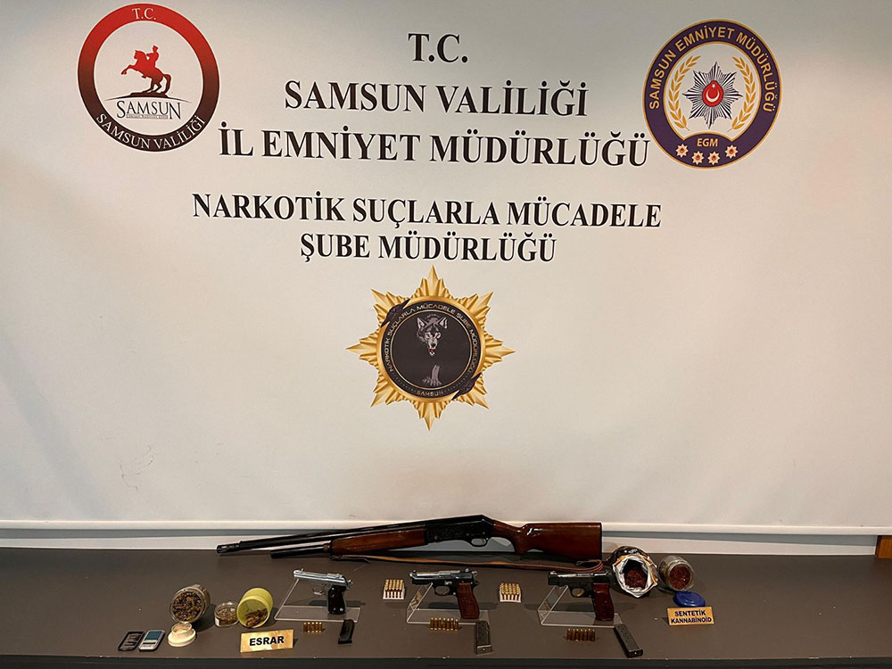 Bir ikamete düzenlenen operasyonda yapılan aramada 3 adet ruhsatsız tabanca, 1 adet ruhsatsız tüfek, 69 adet tabanca fişeği, 35 gram sentetik kannabinoid, 36 gram esrar ve 1 adet hassas terazi ele geçirildi.
