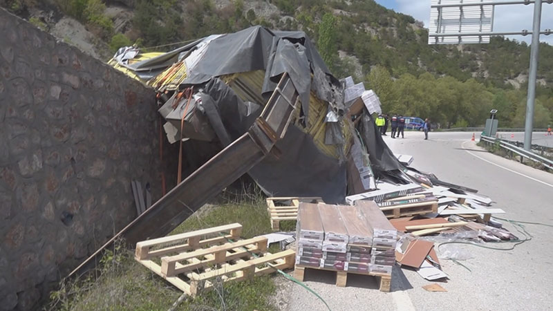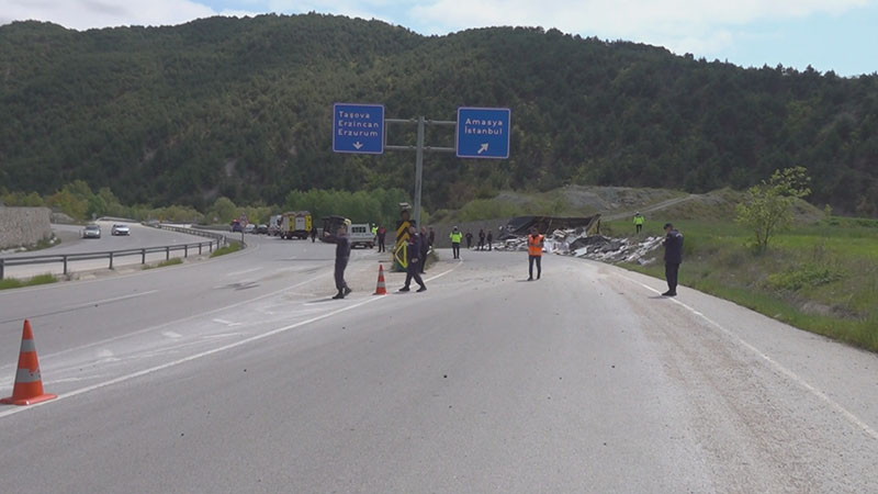Samsun’un Ladik ilçesinden Amasya’nın Taşova ilçesine seyir halindeyken Yılmaz Uzuner’in(40) kontrolünü yitirdiği 37 ABR 875 plakalı parke yüklü TIR, virajı alamayarak devrildi.