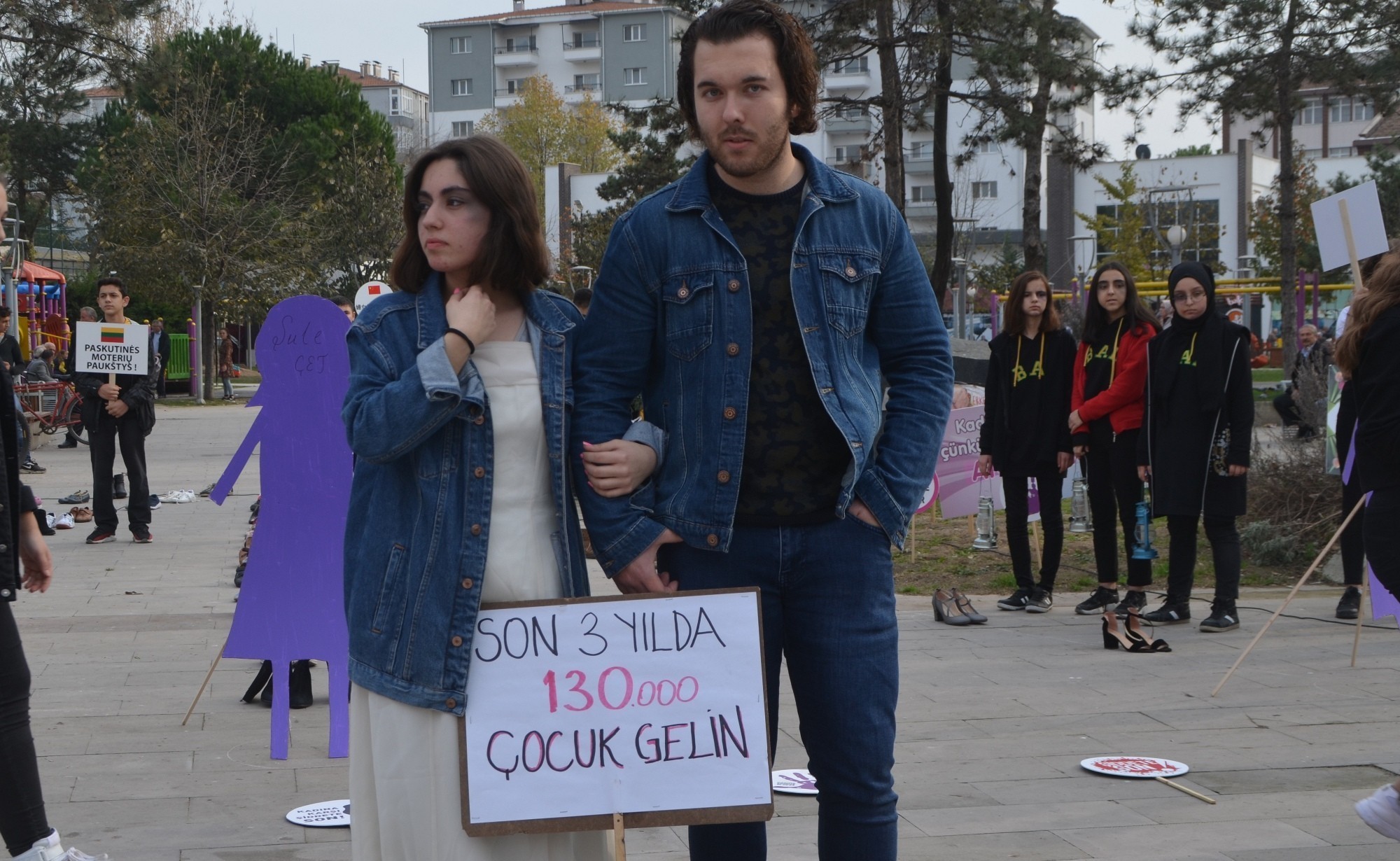 İngilizce öğretmenleri Naim Okay önderliğinde Kadına Yönelik Şiddetle Uluslararası Mücadele Günü doyasıyla Alparslan Türkeş Parkı’nda bir araya gelen öğrenciler, yıl içinde ölen 302 kadını temsilen kana bulanmış 302 çift bayan ayakkabısıyla çarpıcı bir etkinlik yaptılar.