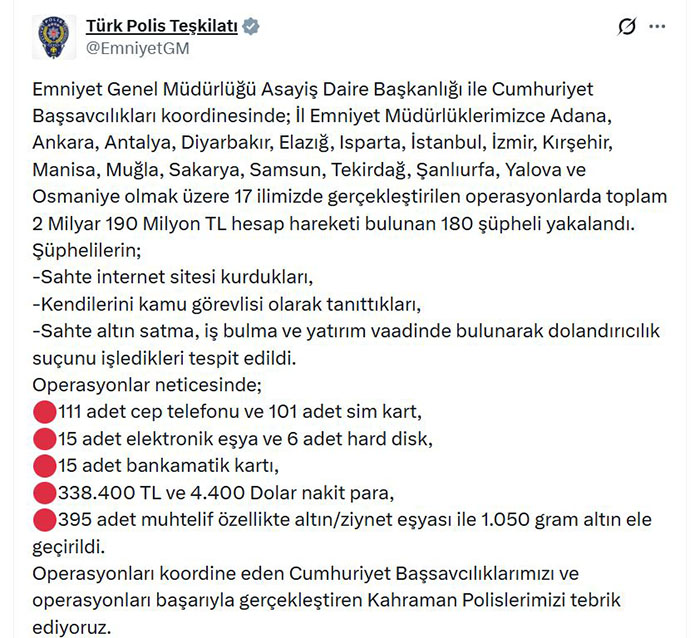 Emniyet Genel Müdürlüğü (EGM), 17 ilde eş zamanlı olarak gerçekleştirdiği operasyonlarda, kendilerini kamu görevlisi olarak tanıtıp sahte altın satma, iş bulma ve yatırım vaadinde bulunarak dolandırıcılık yapan 180 kişiyi gözaltına aldı. Şüphelilerin toplam hesap hareketinin 2 milyar 190 milyon TL olduğu tespit edildi.