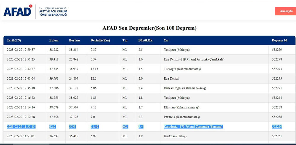 AFAD tarafından da kaydedilen 11.55’teki Karadeniz – [73.76 km] Çarşamba açıklarındaki depremde derinlik 21,46 km, büyüklük ise 3,4 olarak ölçüldü. Sarsıntılar şehir merkezinde hissedilmedi. Son zamanlarda Karadeniz’de benzer depremlerin meydana gelmesi endişeye yol açtı.