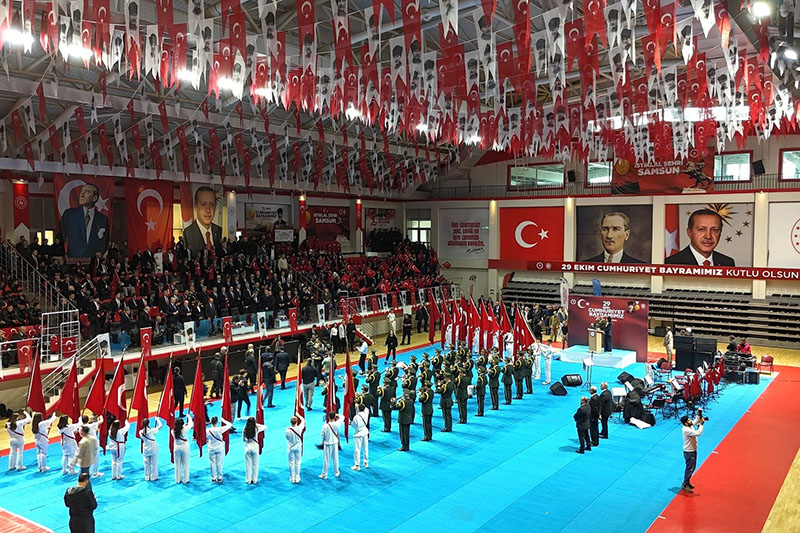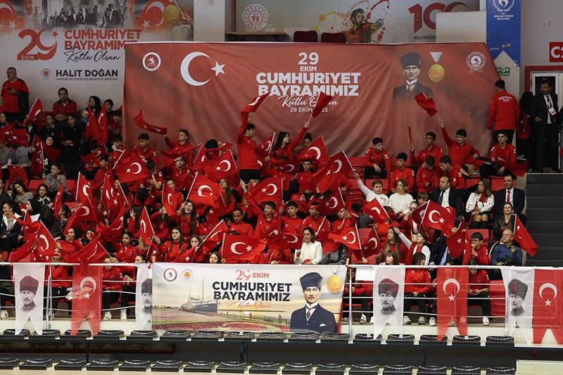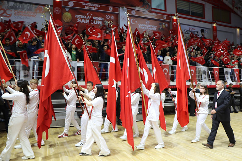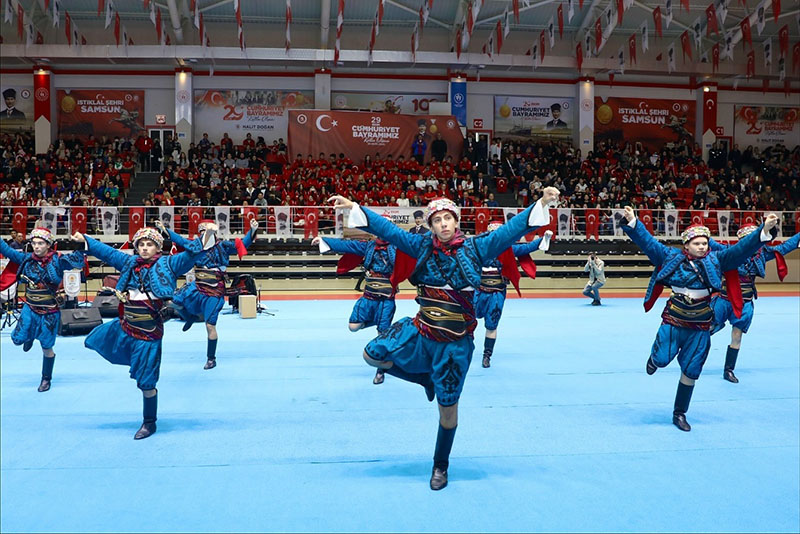 Tören, saygı duruşu ve İstiklal Marşı ile başladı. Salonun tribünlerini dolduran Samsunlular, ellerinde Türk bayraklarıyla coşkulu anlar yaşadı. Öğrenciler, sahneye çıkarak Cumhuriyet temalı şiirler okudu; halk oyunları ekiplerinin gösterileri büyük beğeni topladı.