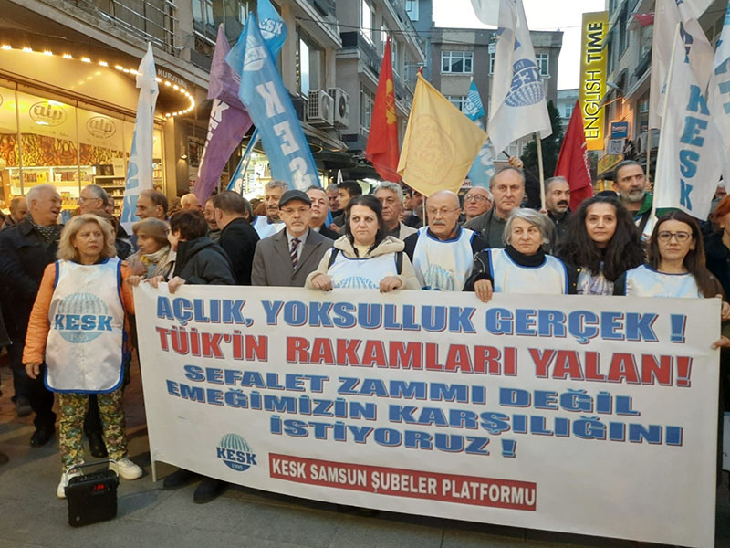 Samsun’da Kamu Emekçileri Sendikaları Konfederasyonu’na(KESK) bağlı sendika üyeleri, yüksek enflasyona rağmen çalışanlara ve emeklilere verilen ücretlere tepki gösterdi. 14 Ocak’ta iş bırakacaklarını açıklayan KESK üyeleri, “Artık TÜİK yalanlarına, yoksulluğa teslim olmayacağız” dedi.