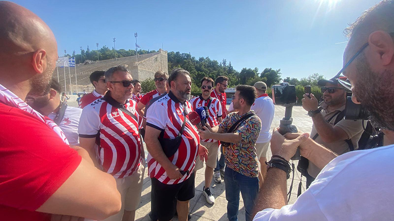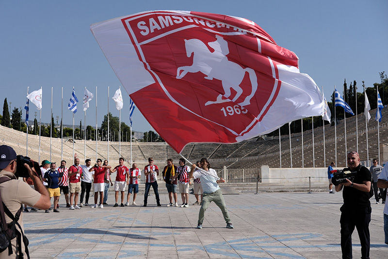 UEFA Avrupa Ligi Play-Off ilk maçında Panathinaikos ile karşılaşan Samsunspor’un taraftarları, maç öncesi Atina’nın Kallimarmaron semtinde bir araya geldi. Türkiye’nin yanı sıra Avrupa’nın farklı ülkelerinden gelen kırmızı-beyazlı taraftarlar, ellerindeki bayraklarla kenti renklendirdi. Samsunspor tezahüratlarıyla Atina sokaklarını inleten taraftarlar, maç öncesinde takımlarına destek gösterisinde bulundu. Polis ekipleri bölgede güvenlik önlemleri alırken, taraftarların coşkulu kutlamaları renkli görüntülere sahne oldu.