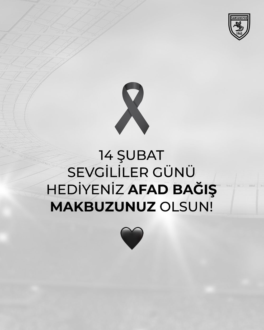 Samsunspor‘un sosyal medya hesabından yapılan açıklamada, “14 Şubat Sevgililer Günü Hediyeniz AFAD Bağış Makbuzunuz Olsun” denildi.