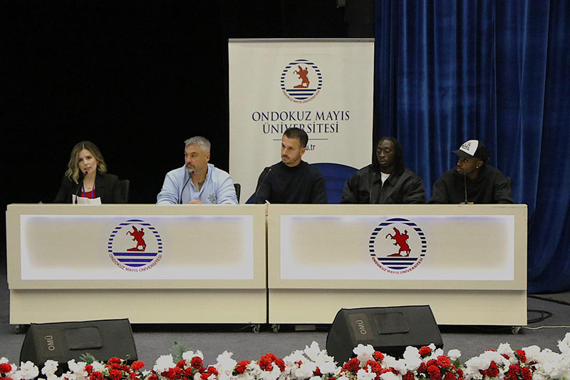 Samsunspor Teknik Direktörü Thomas Reis ile takımın oyuncularından Tanguy Coulibaly ve Antoine Makoumbou, OMÜ Atatürk Kongre ve Kültür merkezinde öğrencilerle bir araya geldi