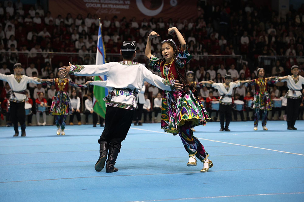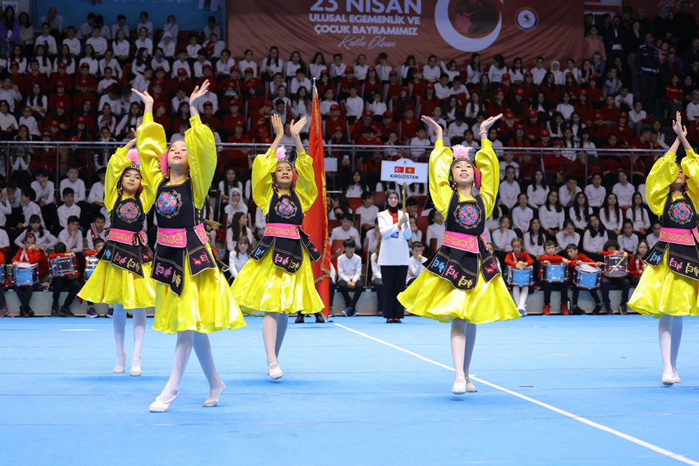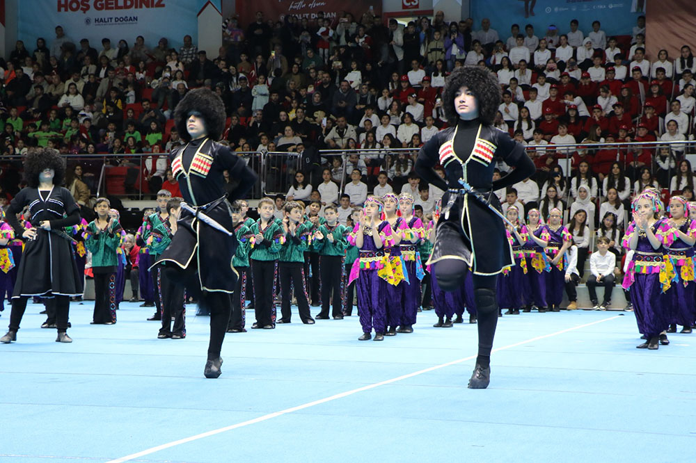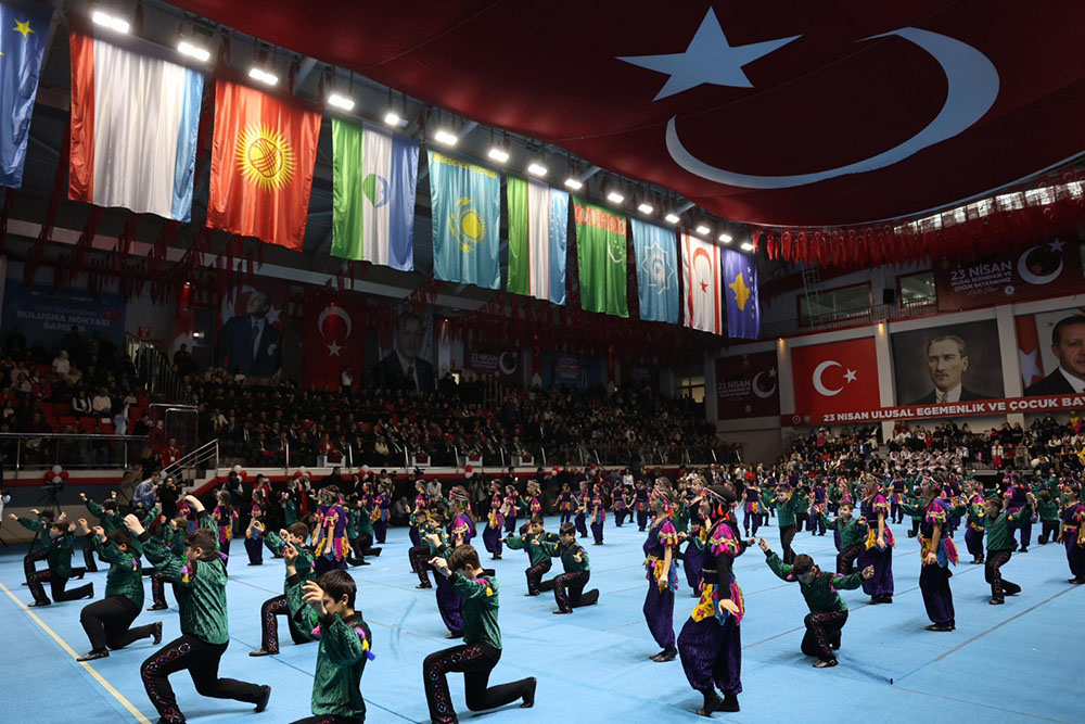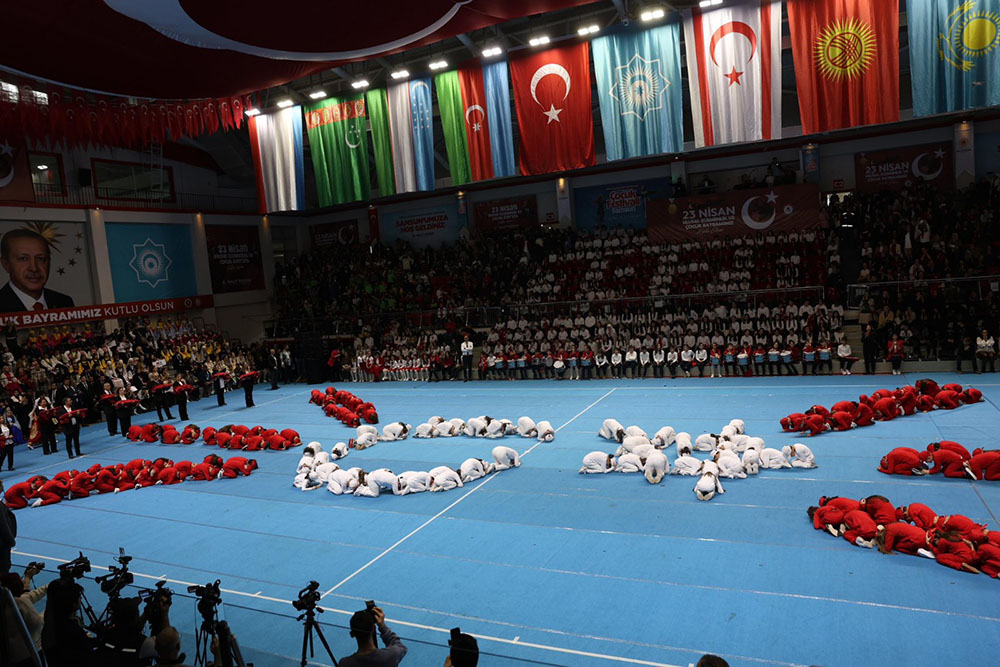 Daha sonra Mustafa Dağıstanlı Spor Salonu’nda gerçekleştirilen program ise askeri bandonun ‘Bir Başkadır Benim Memleketim’ ve ‘En Büyük Bayram Bu Bayram’ şarkılarını seslendirmesi ve ardından yapılan geçit töreniyle başladı. Saygı duruşu ve İstiklal Marşı’nın okunmasının ardından Milli Eğitim Bakanı Yusuf Tekin’in günün anlam ve önemini belirten mesajı da paylaşıldı. Öğrencilerin şiirler okuduğu programda, çocuk korosu ve Türk Dünyası Çocuk Festivali’ne katılan çocukların ortak final gösterileri de sahnelendi.