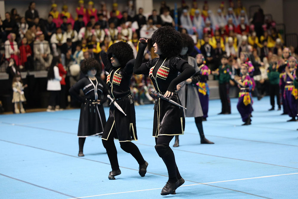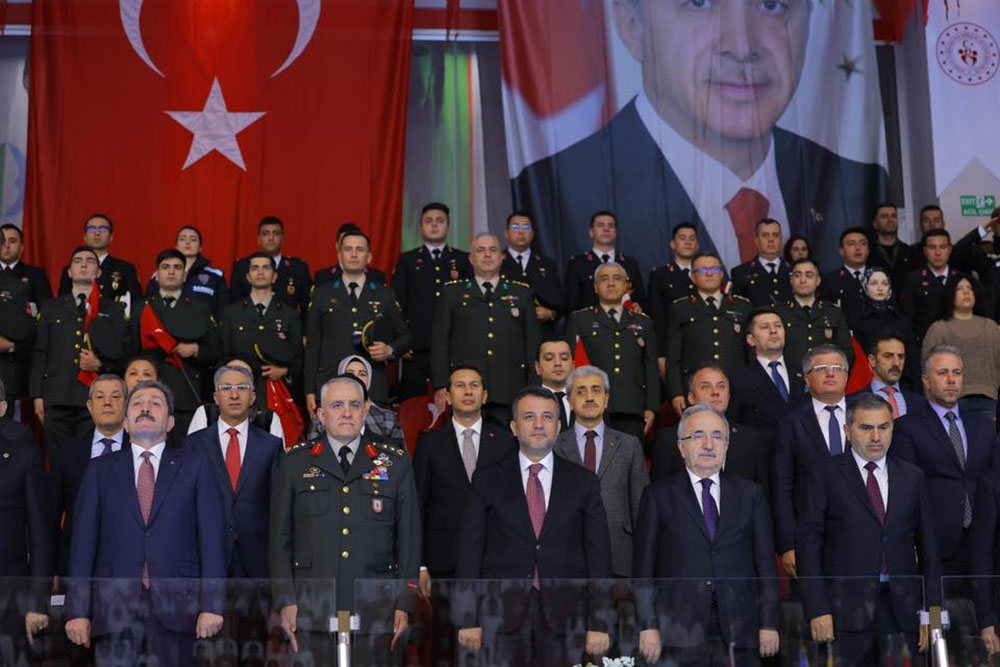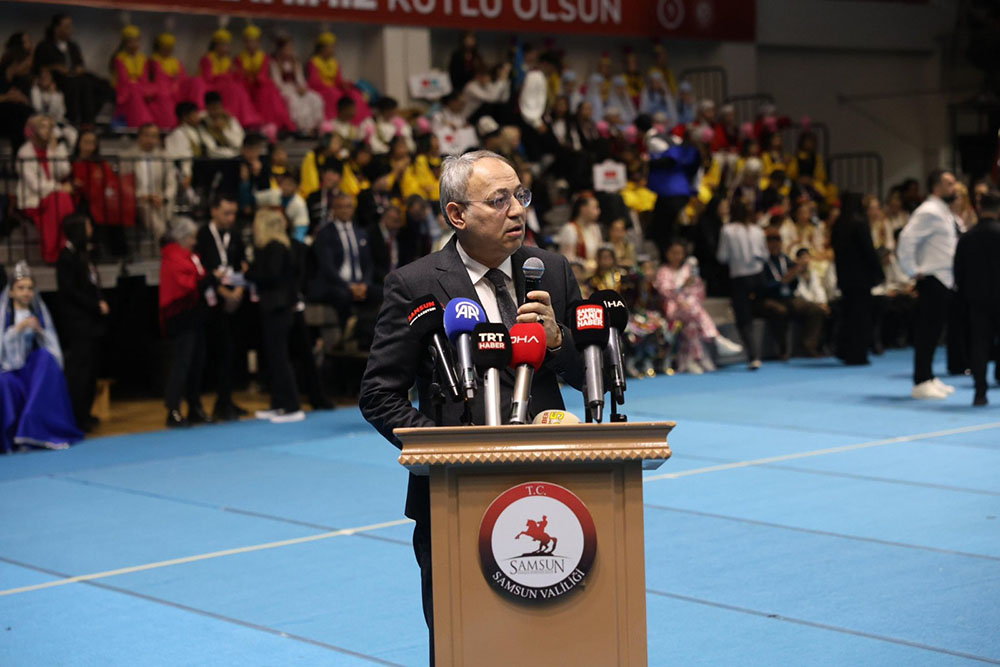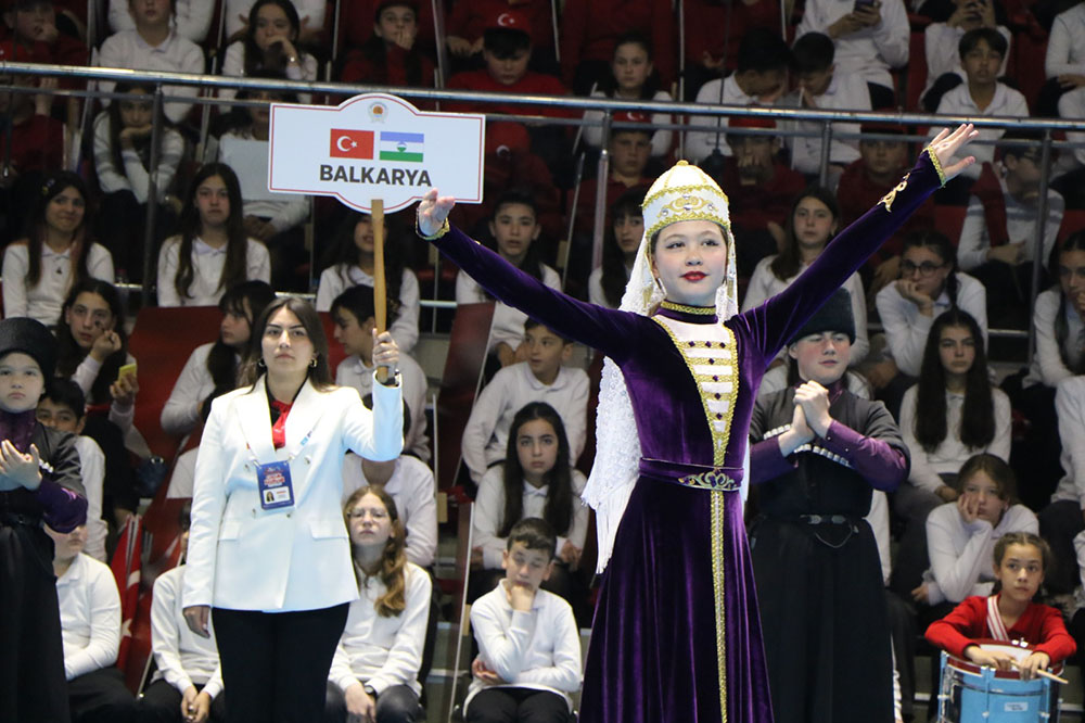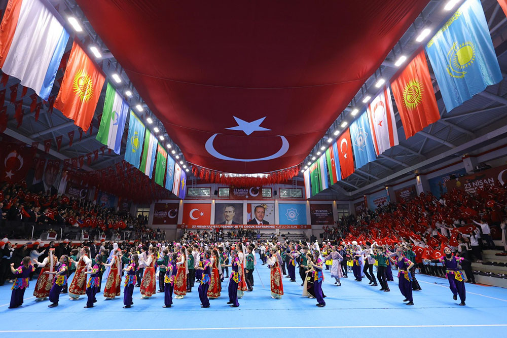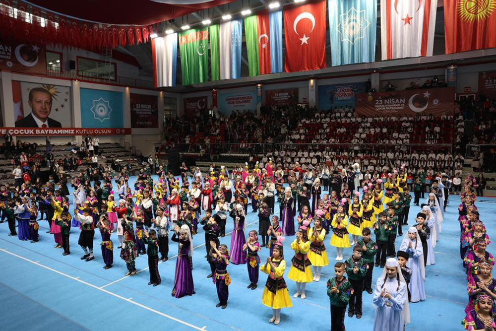 Daha sonra Mustafa Dağıstanlı Spor Salonu’nda gerçekleştirilen program ise askeri bandonun ‘Bir Başkadır Benim Memleketim’ ve ‘En Büyük Bayram Bu Bayram’ şarkılarını seslendirmesi ve ardından yapılan geçit töreniyle başladı. Saygı duruşu ve İstiklal Marşı’nın okunmasının ardından Milli Eğitim Bakanı Yusuf Tekin’in günün anlam ve önemini belirten mesajı da paylaşıldı. Öğrencilerin şiirler okuduğu programda, çocuk korosu ve Türk Dünyası Çocuk Festivali’ne katılan çocukların ortak final gösterileri de sahnelendi.