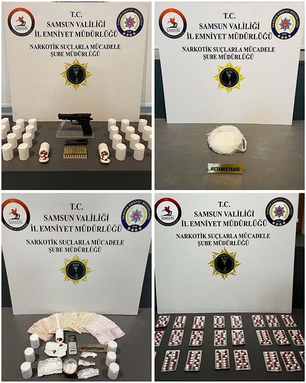 Bu kapsamda ilorak İlkadım, Tekkeköy ve Havza ilçelerinde eş zamanlı operasyon düzenlendi. Yapılan üst, araç ve ikamet aramalarında 3 bin 474 adet sentetik ecza, 220,59 gram metamfetamin, 22,4 gram esrar, 18,3 ml fubinaca, 2,31 gram sentetik kannabinoid, 2 adet uyuşturucu kullanım aparatı, 1 adet hassas terazi, 1 adet ruhsatsız tabanca ve 50 adet tabanca fişeği, uyuşturucu madde ticaretinden elde edildiği değerlendirilen 18 bin 620 TL nakit para ele geçirildi.
