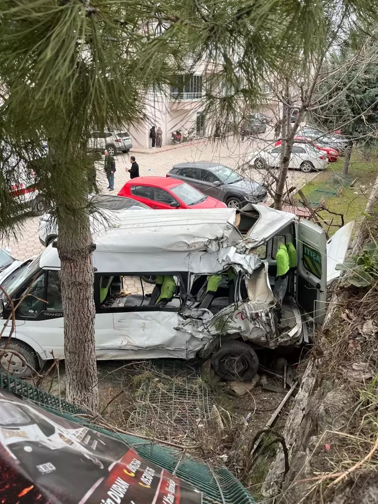 Çarpmanın etkisiyle Bahçekonak Mahallesi’nden öğrencileri okula götüren 55 PG 391 plakalı servis minibüsü, yol kenarındaki sitenin yaklaşık 4 metre yüksekliğindeki bahçesine düştü.